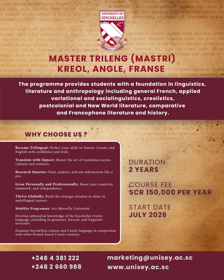 The Creole Language and Culture Research Institute (CLCRI) was set up by the University of Seychelles in October 2016, to stimulate, facilitate and lead research in Creole studies in the country, with particular attention to the Seychellois Creole language and culture.