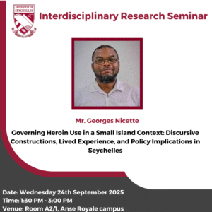 Events Interdisciplinary Research Seminar- Governing Heroin Use in a Small Island Context: Discursive Constructions, Lived Experience, and Policy Implications in Seychelles by Mr. Georges Nicette Read More » September 19, 2025
