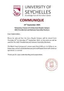 News Communique_Stakeholders_Temporary Closure of UniSey Anse Royale Campus Read More » September 23, 2025