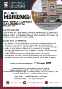Jobs Vacancy- September 2025 – Maintenance Technician (Air Conditioning) Read More » September 18, 2025