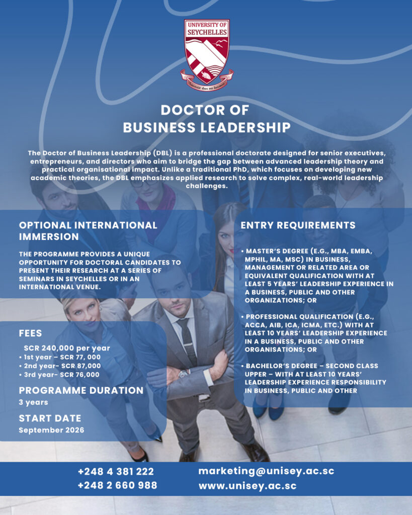 Our graduates, including some from Europe, are not only to be found in both public and private sector organisations but are also fast ladder climbers. They include: directors, managers, lawyers, marketing entrepreneurs; and, more specifically, a member of the National Assembly of Seychelles, a Chief Executive Officer, a Director General in the Government of Seychelles. While they are collectively impacting individual lives and the wider society in immeasurable ways, our graduates are nonetheless helping to shape the future of society.