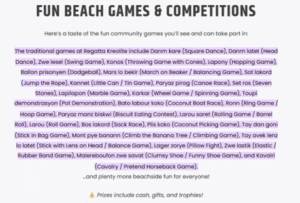Regatta I byen koni pour son bann zwe tradisyonnel ki ede pour promote diversifikasyon dan tourizm sportif e tourizm kiltirel. Bann sport lo delo i varye ‘sailing, windsurfing; Kayaking. Bann sport kiltirel I enkli poto lagres, zorye, paryaz pirog, kartye maron.